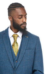Styled to create a true impression, this eye-catching blue tweed suit boasts the finest in a luxury look, with a coordinating pocket square, stylish gold contrast lining and the Marc Darcy seal of quality lapel pin.
