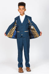 Our children's Dion Tweed Herringbone Blue Suit will make any little chap stand out and have them looking stylish and incredibly dapper This blue tweed three-piece suit features contrasting trim detail to the pockets, luxurious lining with matching pocket square and Marc Darcy lapel pin badge. A firm favourite for weddings, we have matching accessories available for your Groom & Ushers.