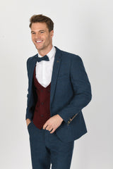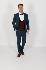 Pairing our Dion Suit in Blue with our Kelly wine waistcoat will impress for all the right reasons.