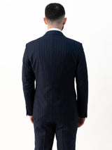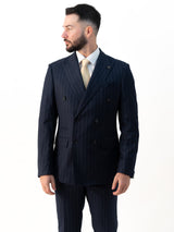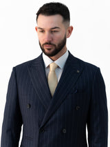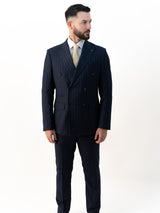 Elevate your formal wardrobe with the Connor Navy Pinstripe Double-Breasted Suit – a quintessential blend of timeless British style and modern tailoring. Crafted with precision, this two-piece suit features a sharp navy base with classic pinstripe detailing, exuding sophistication and confidence.