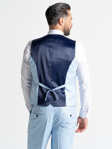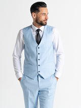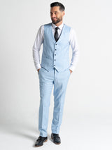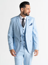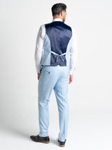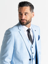 The brand new edward suit is sure to bring something unique into your wardrobe. 3 piece suit featuring a notch lapel sky blue slim fit blazer with complimentary pocket square and sky blue single breasted waistcoat with sky blue slim fit trousers.
