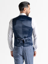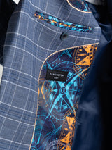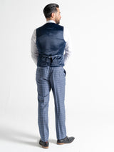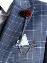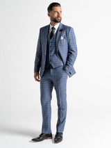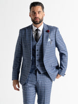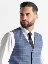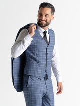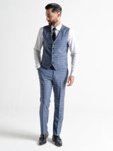 This slim-fit suit will give you the best look to match any occasion. 3-piece suit featuring a light blue with white and blue checks detailing a slim fit blazer with complimentary pocket square and chain fastening on the lapel with matching waistcoat and slim fit trousers.