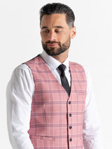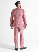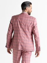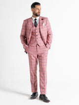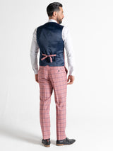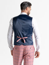 This slim fit suit will give you the best look to match any occasion. 3 piece suit featuring a rose with white and navy blue checks detailing a slim fit blazer with complimentary pocket square and chain fastening on the lapel with matching waistcoat and slim fit trousers.