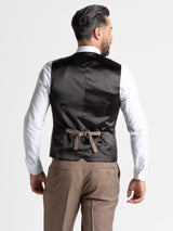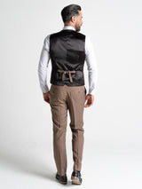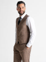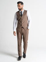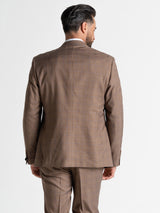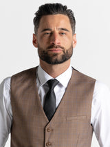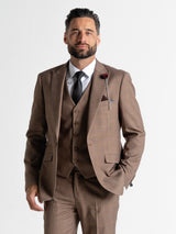 Be the best-dressed man in every room you walk into. our new slim fit 3 piece suit features a brown with white checks detailing a slim fit blazer with complimentary pocket square and chain fastening on the lapel with matching waistcoat and slim fit trousers.