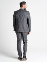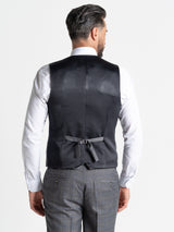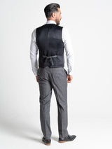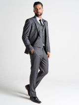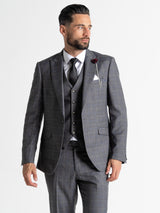 Be the best dressed man in every room you walk into. our new slim fit 3 piece suit featuring a dark grey with white checks detailing slim fit blazer with complimentary pocket square and chain fastening on the lapel with matching waistcoat and slim fit trousers.