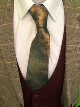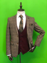 BROWN TWEED SUITS WITH WINE CONTRAST WAISTCOAT AND GOLD PAISLEY PRINT TIE SET