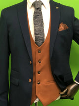 Max Navy Suit with Kelly Tan Waistcoats, Navy Marl Knitted Tie and Camo Pocket Square