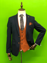 Built for the modern man, this textured navy suit is ideal for when the occasion calls for something a little more formal. We have added a dash of contrast in the way of a tan single breasted waistcoat to this outfit to keep you from looking like a office keyboard blaster at your best friends wedding. The tan buttons to this navy three piece suit match up to the waistcoat and ideally a tan pair of shoes would complete this outfit complimented by an outrageous camo lining on the inside we have added a pocket square to connect all the dots perfectly.