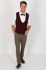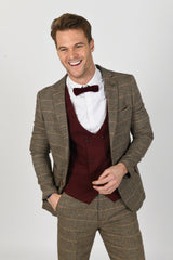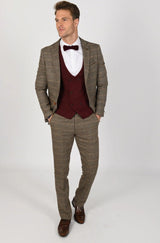 TED TAN SUIT WITH KELLY WINE DOUBLE BREASTED WAISTCOAT | Office suit | Check Suit | Wedding Suit