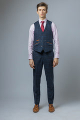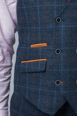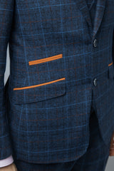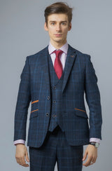 This Ryan Navy Blue Tweed Suit features a heritage design with a check print in a faint sky blue tone giving it the perfect summer effect married with contrast velvet tan trims to the pocket flaps bringing this style to the forefront of men's groom wear. Buttonhole stitching and contrast buttons bring more depth to the design. All in all a classy dapper tweed suit is perfect for any occasion.