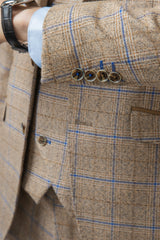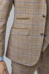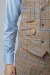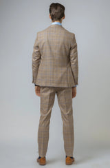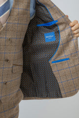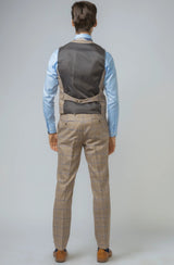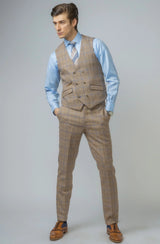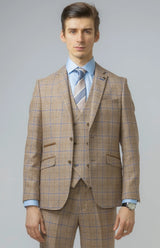Look the best in the room with this contemporary Robert Simon David biscuit colour suit with a brown and navy check finish with contrast brown details on the pockets, this suave three-piece is stylish and timeless in its design with a double-breasted waistcoat to add extra flavour to your outfit. Perfect for weddings, parties or work.