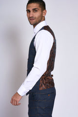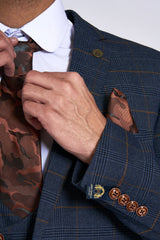 Make a statement that counts. This navy suit with a stylish windowpane check will guarantee you're ticking all the right trend boxes. Fully lined in a burnished camo print lining, the aesthetic is refined but modern while the slim tailored fit makes it the perfect choice for both casual and formal occasions alike. The accompanying waistcoat is double-breasted with welt pockets to either side and matching camo print lining to the back.