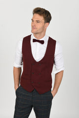 Use this piece to create a sharp contrast in any suit you purchase from men's tweed suits. Meticulously cut in a slim tailored fit, this double-breasted waistcoat features a six-button front, welt front pockets, and sleek contrast reverse. The rich wine is easy to wear season to season, whilst the simple design will make it easy pairings for almost any look.