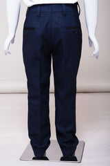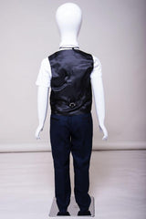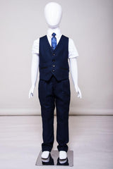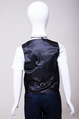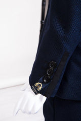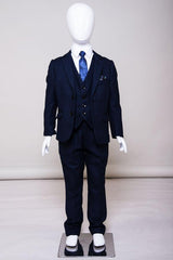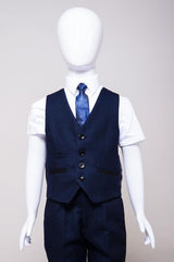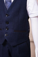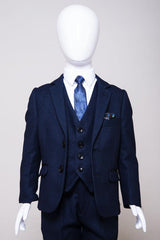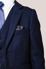 Perfect for formal occasions, this boy's navy three piece suit features a birdseye print to match the Men's Callum Suit. It has a double button fastening to the blazer contrast trimmed flap pockets and welt breast pocket with pocket square matching the inside lining. The single breasted waistcoat also features contrast trim detail to the pockets along with an adjuster strap to the reverse for ease of wear.