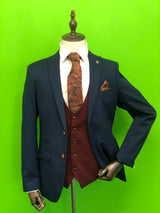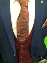 We always try and add something different to our style, this three piece suit states just that. bringing in to play the camo print tie to centre of attention matching the buttons and stitching to the jacket and trousers and adding that distinctive wine waistcoat gives you a slick finish.
